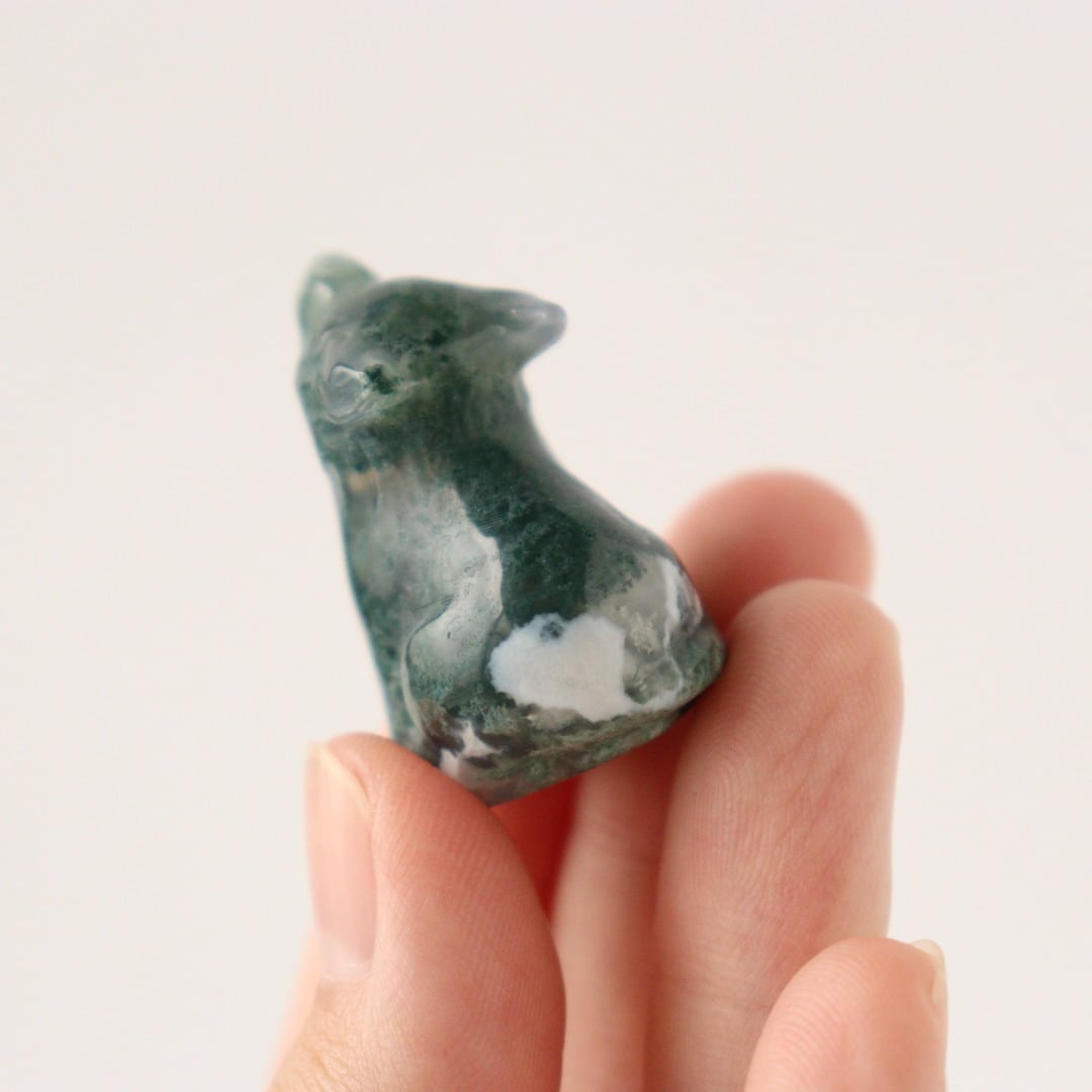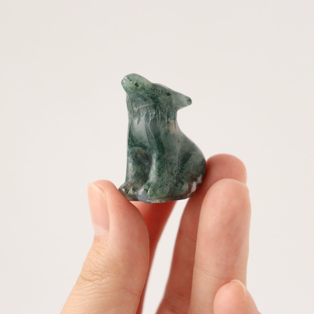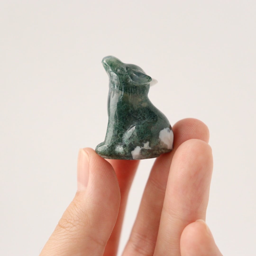 こちらは、ちょこんと座った姿のモスアゲートの狼。