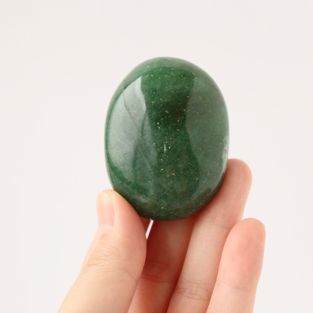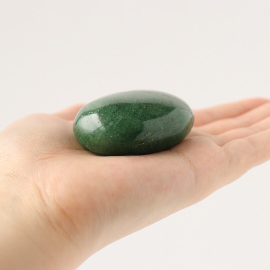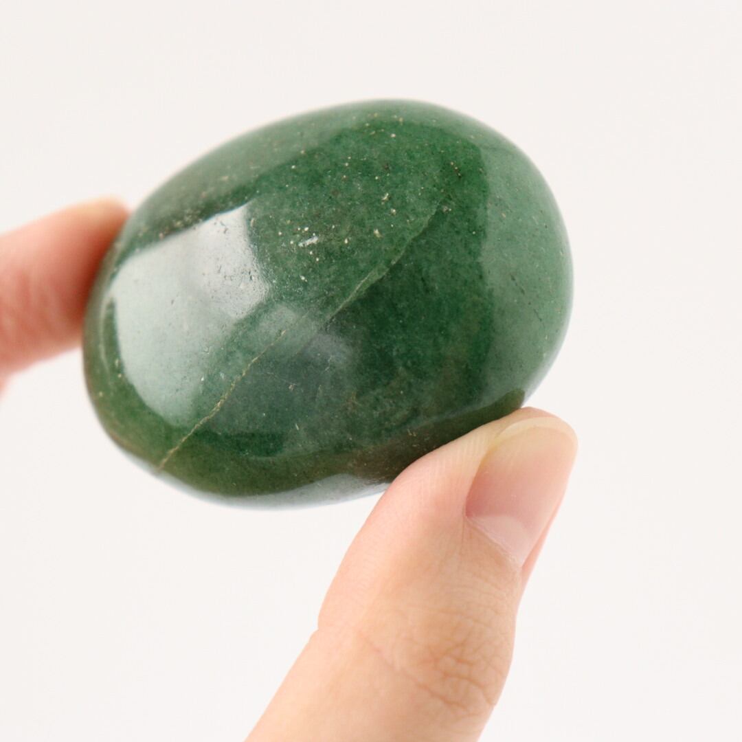 静かに深まる森のような、濃密なグリーンが美しい、グリーンアフリカンストロベリークォーツの握り石。