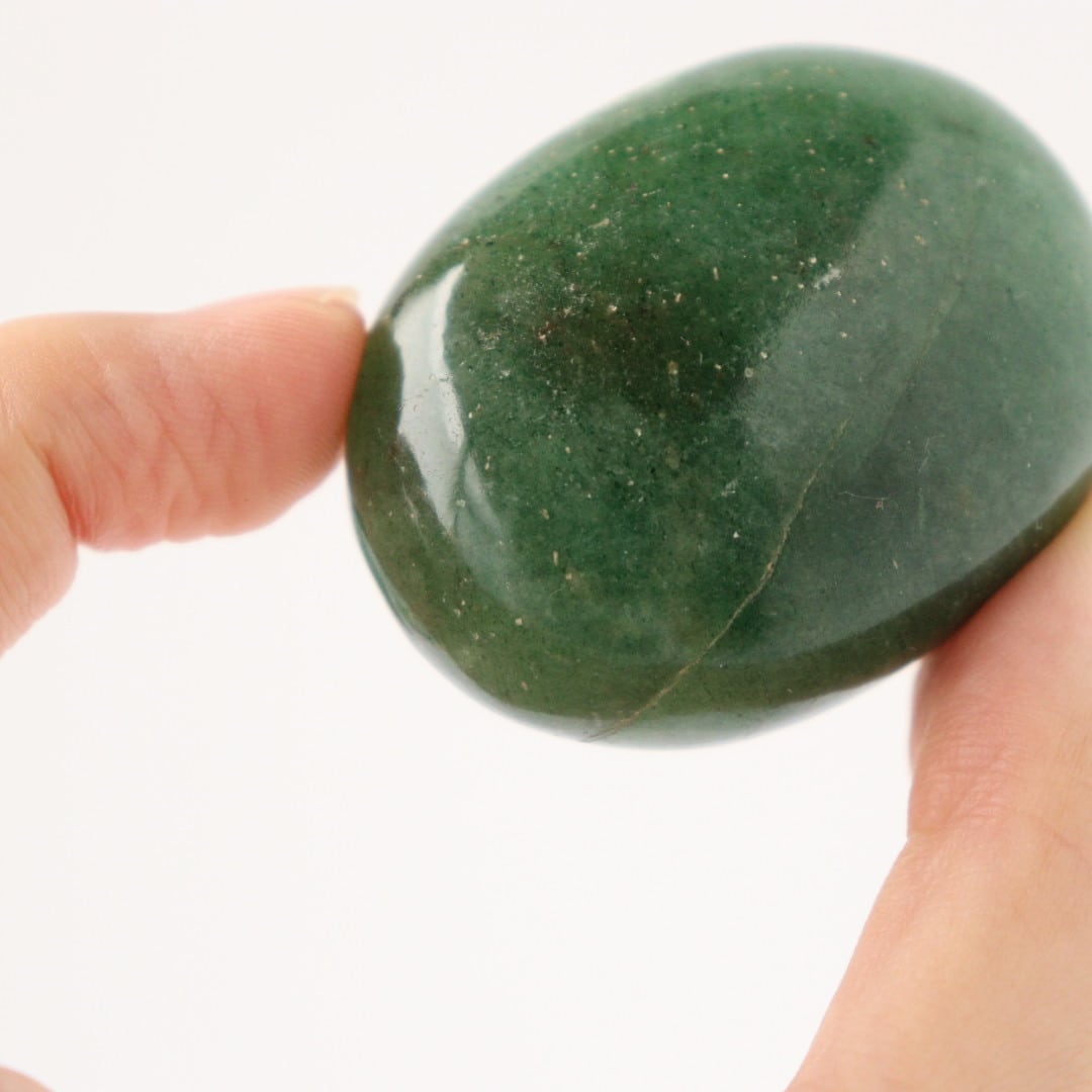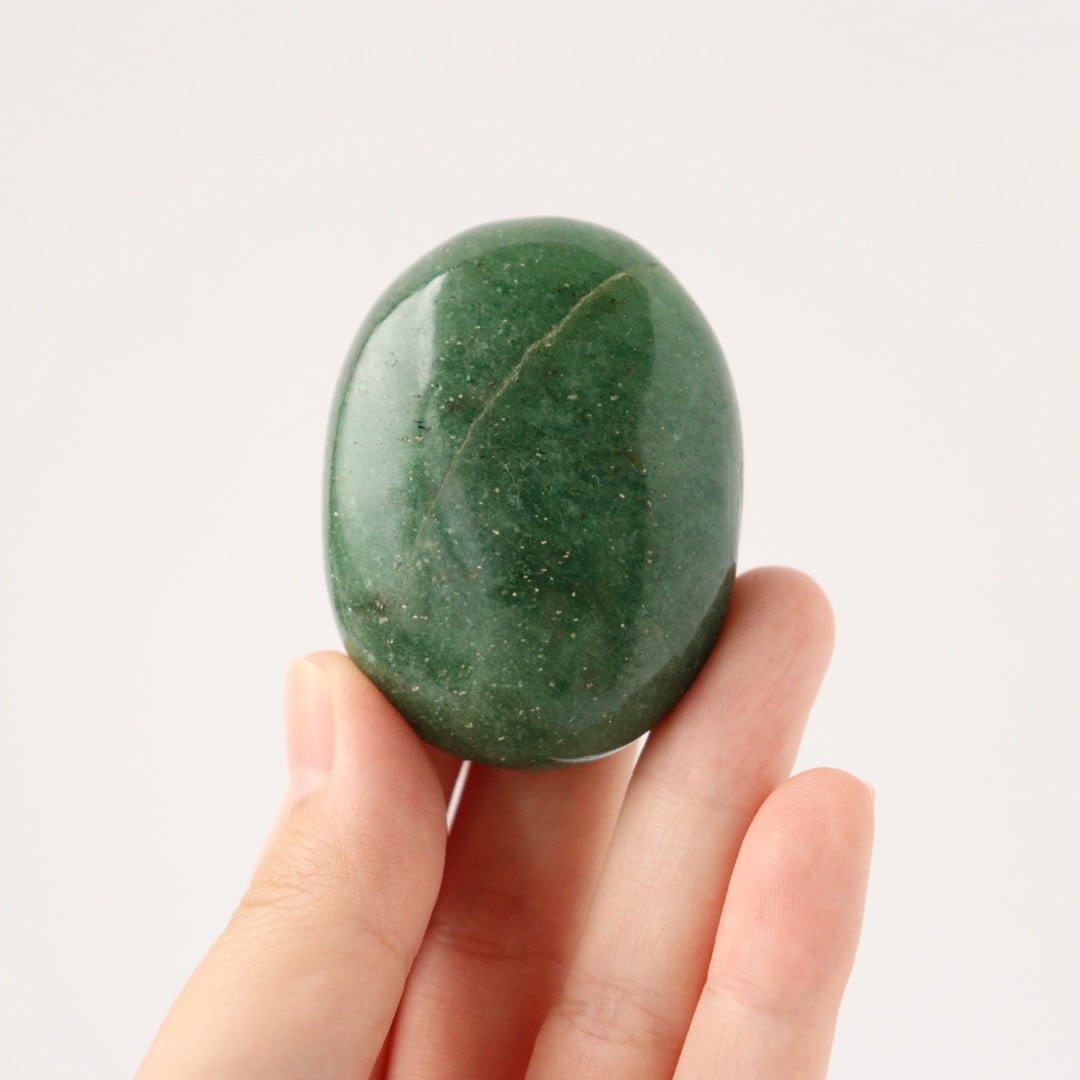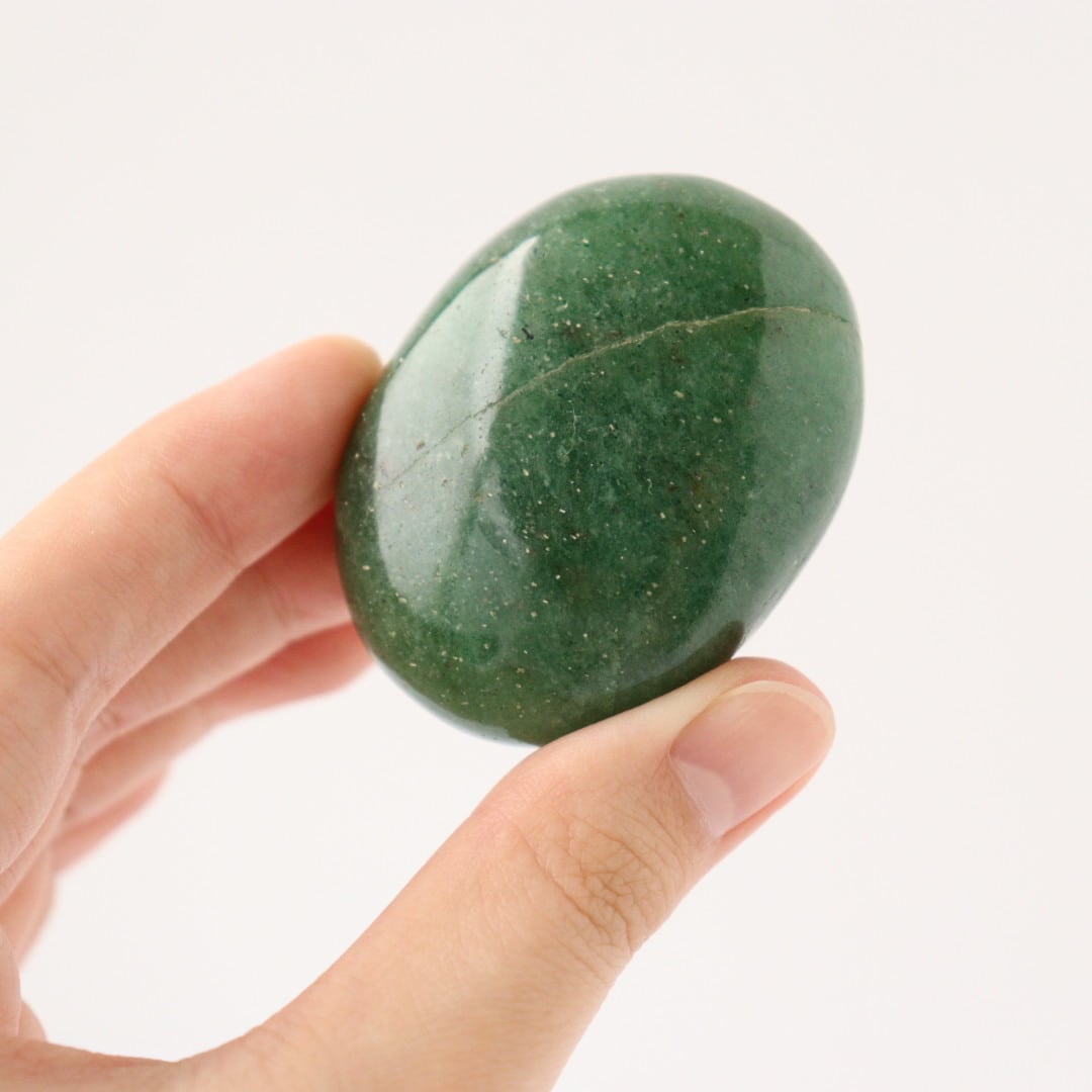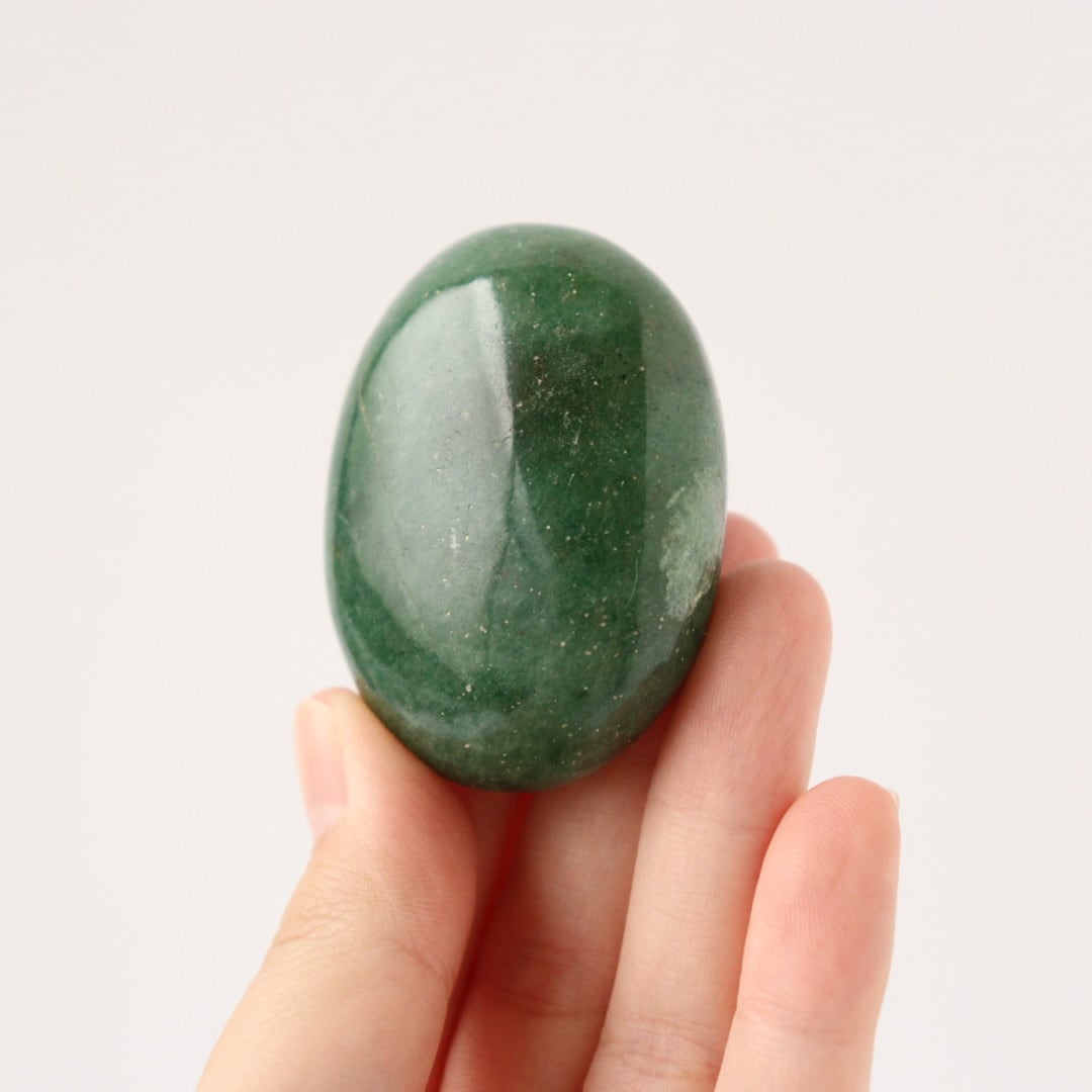 静かに深まる森のような、濃密なグリーンが美しい、グリーンアフリカンストロベリークォーツの握り石。