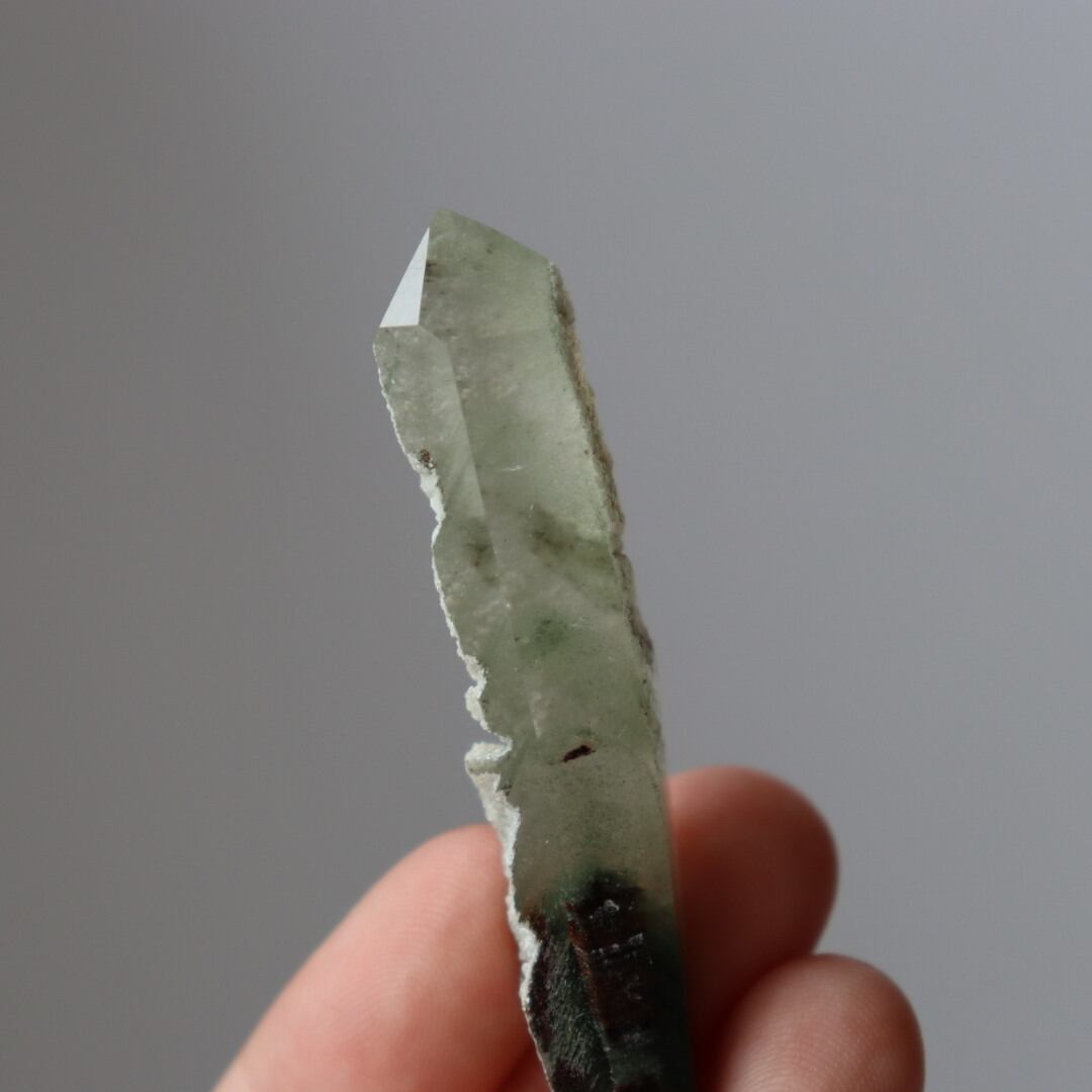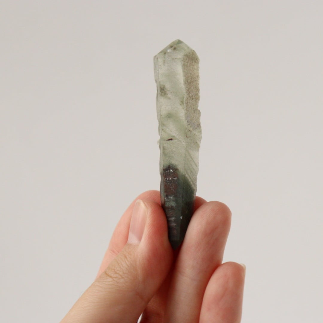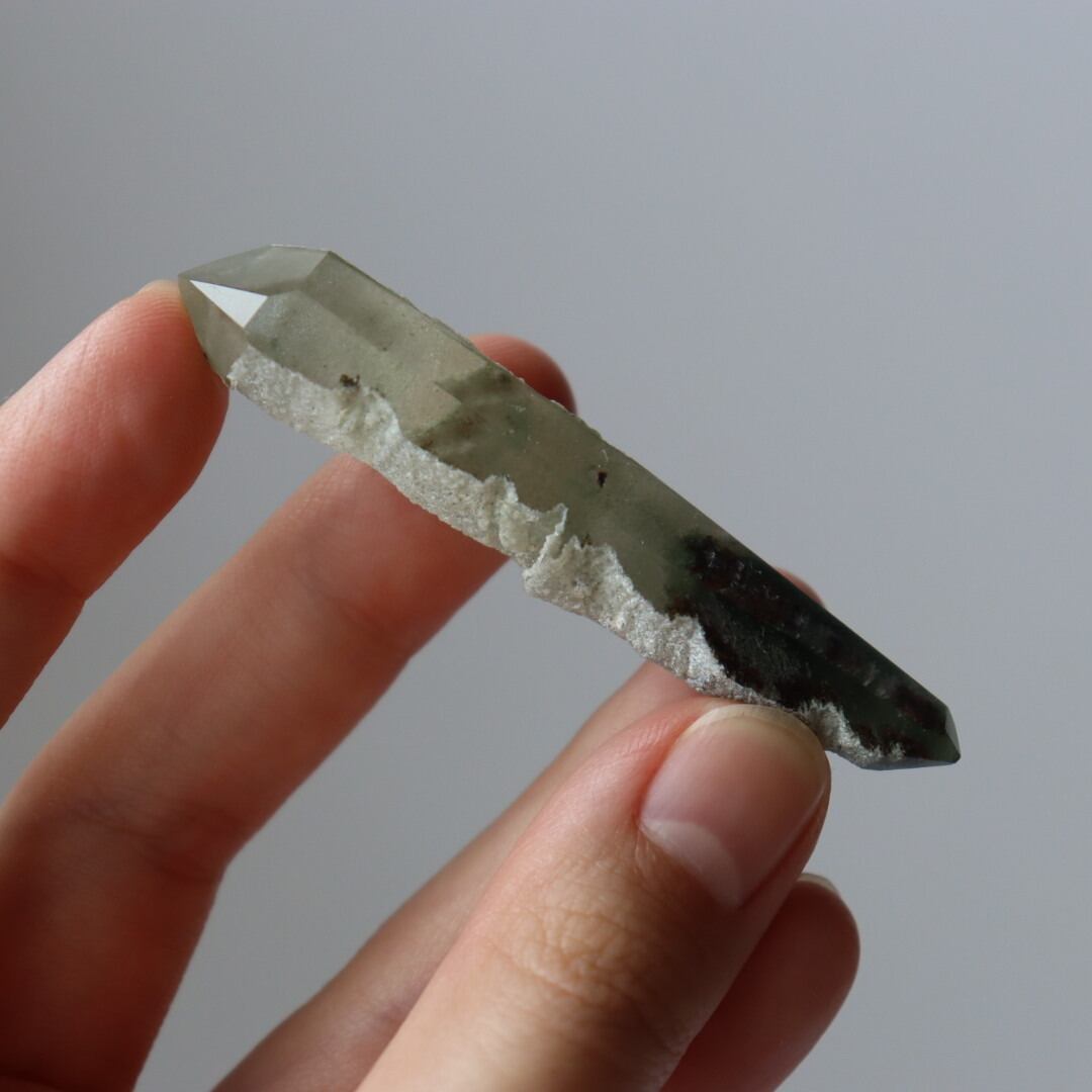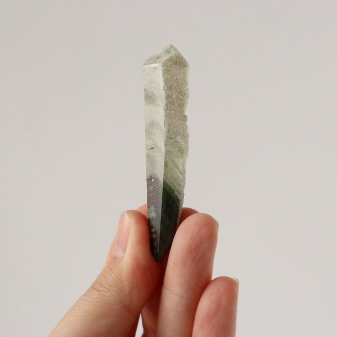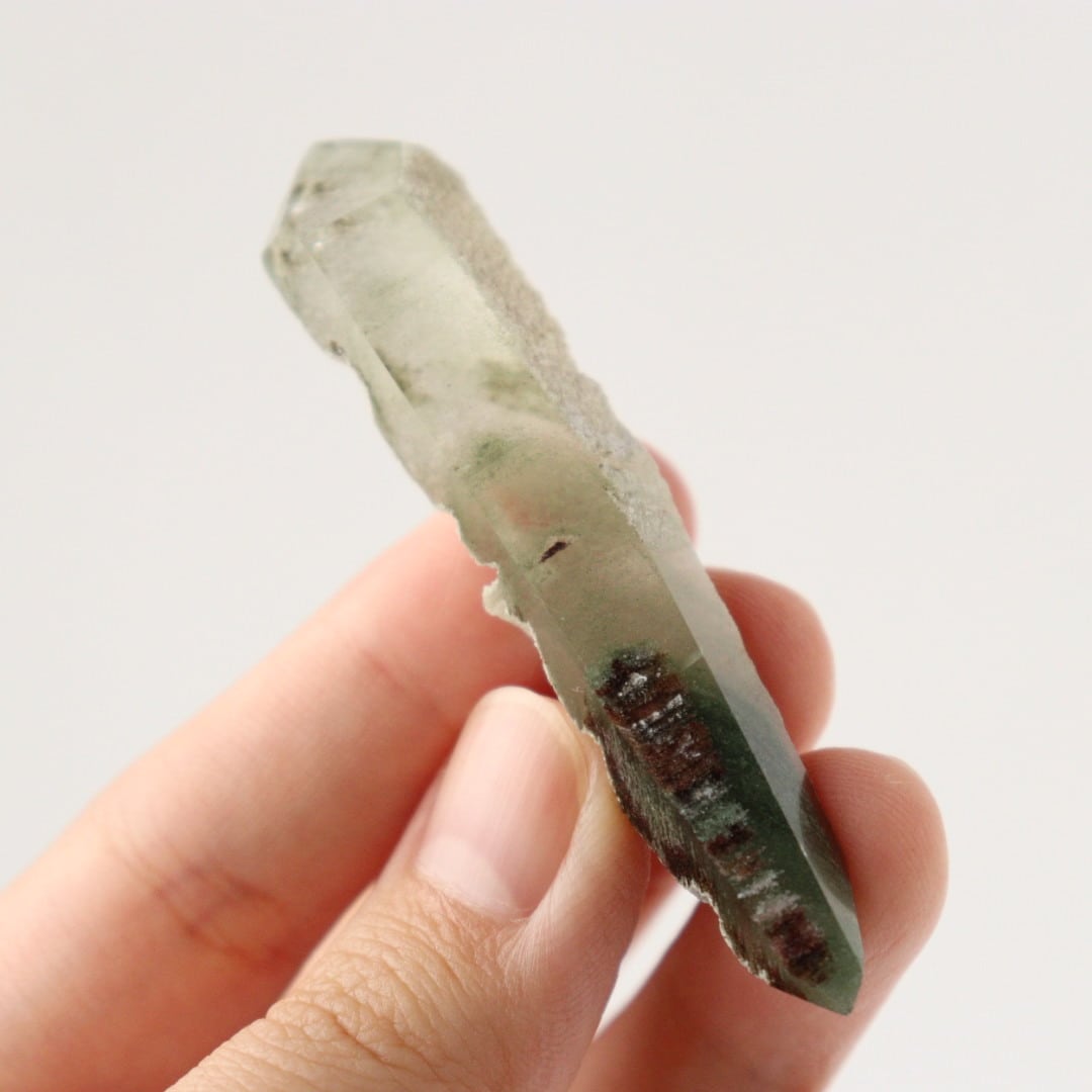 ブラジル・ミナスジェライス州コリント産のクロライトインクォーツ原石ポイント。