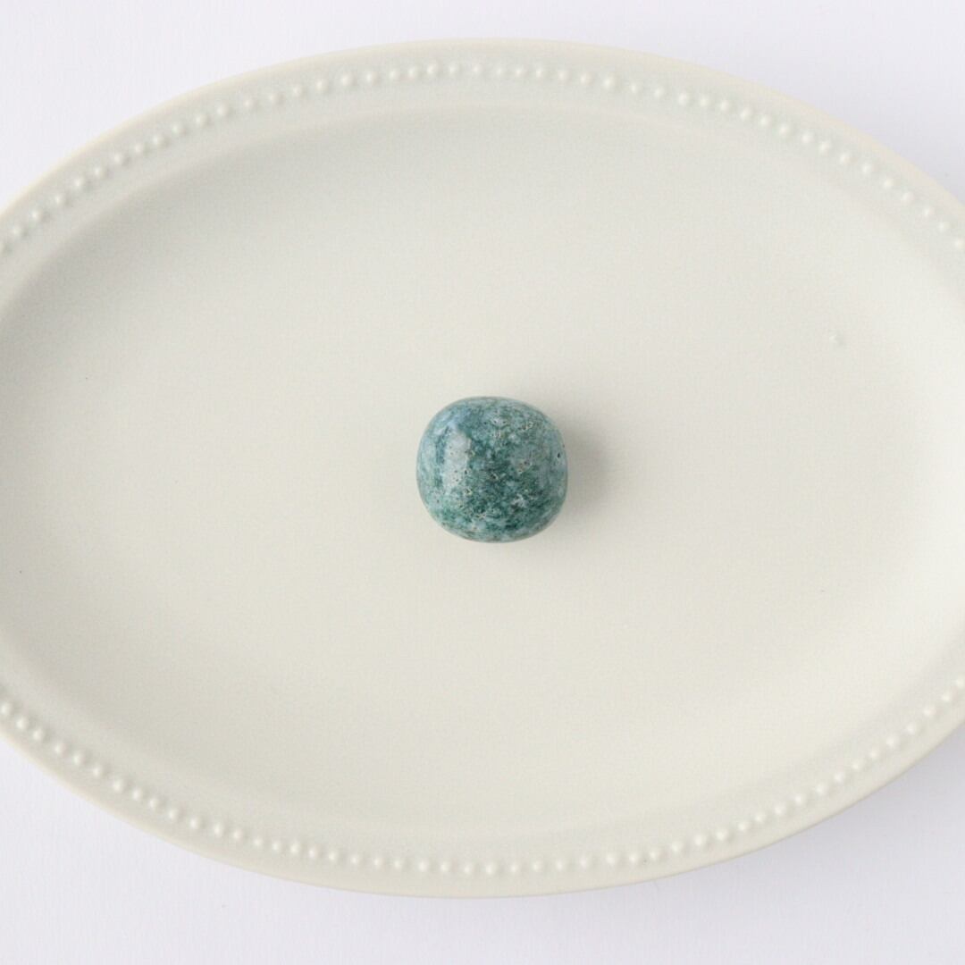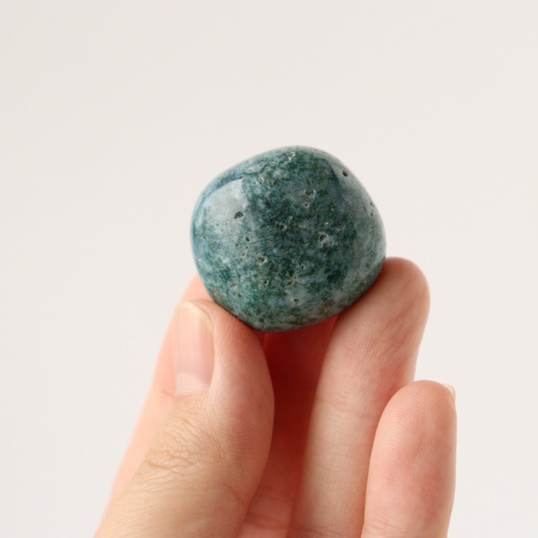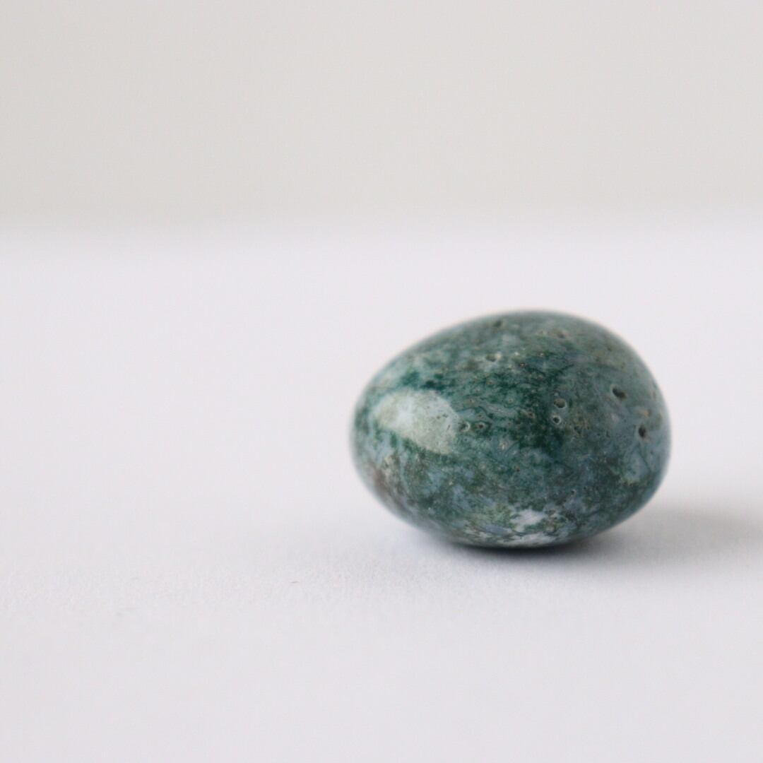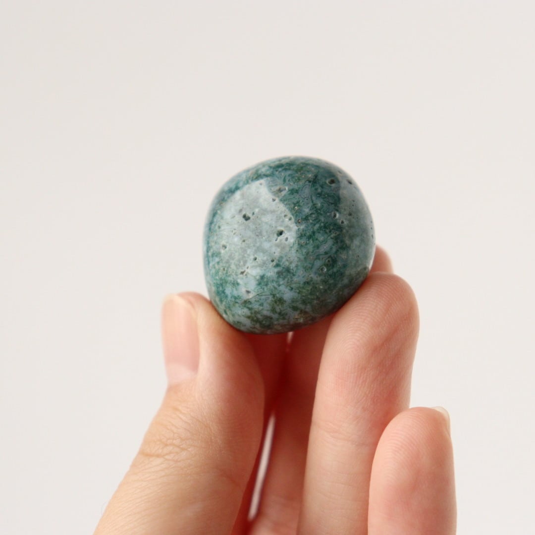 ホワイトとナチュラルグリーンが混ざり合う、モスアゲートのタンブル。