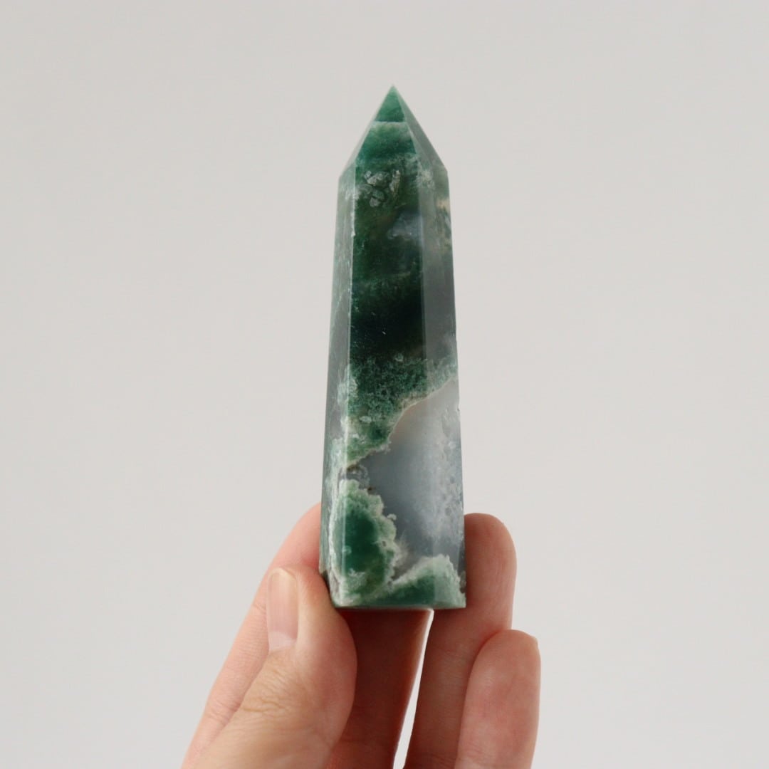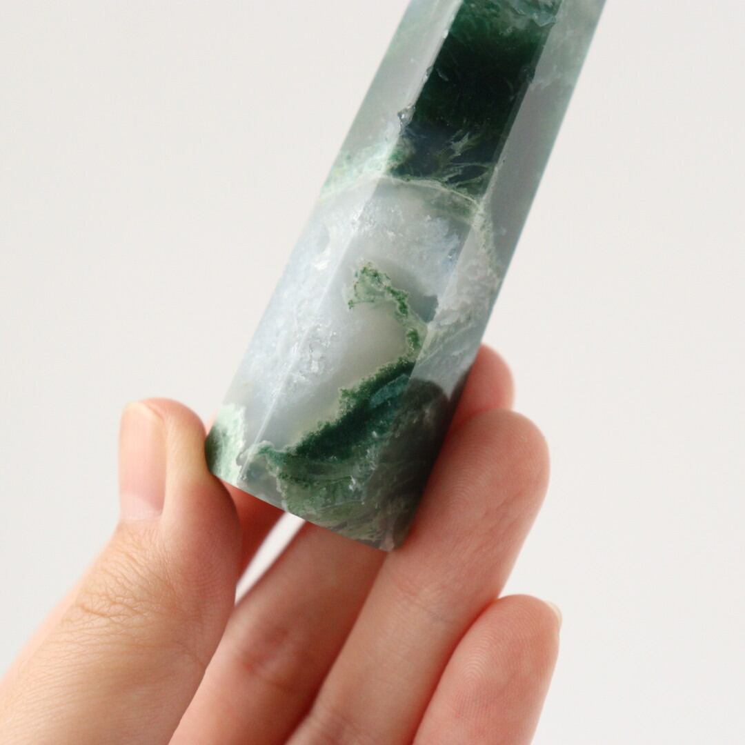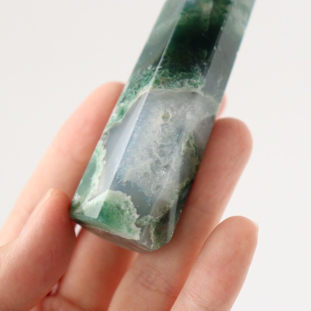 こちらは、透明感のある部分と深いグリーンが織りなすコントラストが特に美しいモスアゲートのタワー。まるで5月の新緑や常緑樹林を眺めているかのような、いにしえから続く生命の気配を思わせるような表情を持っています。