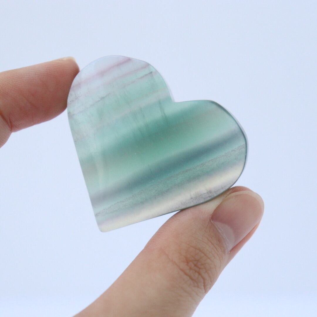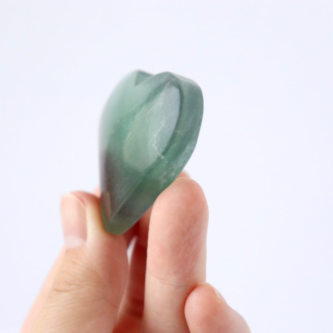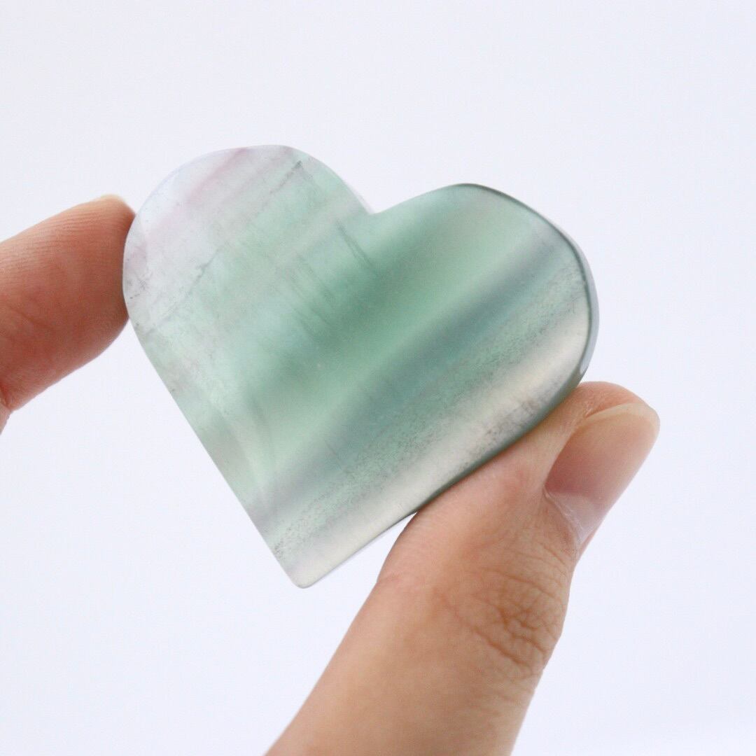 つい触りたくなるような不思議な可愛らしさのグリーンフローライトのハートです。
