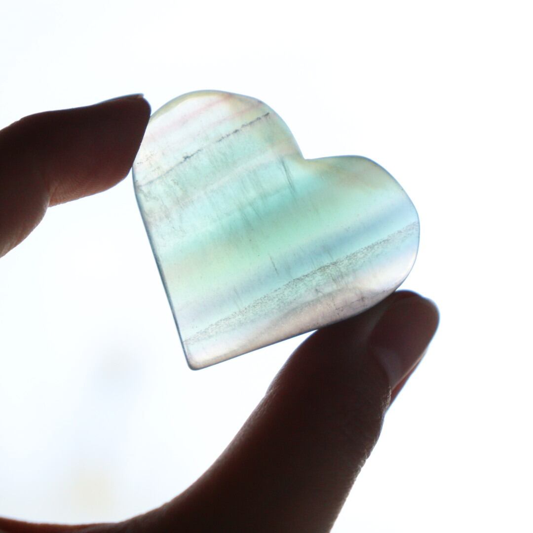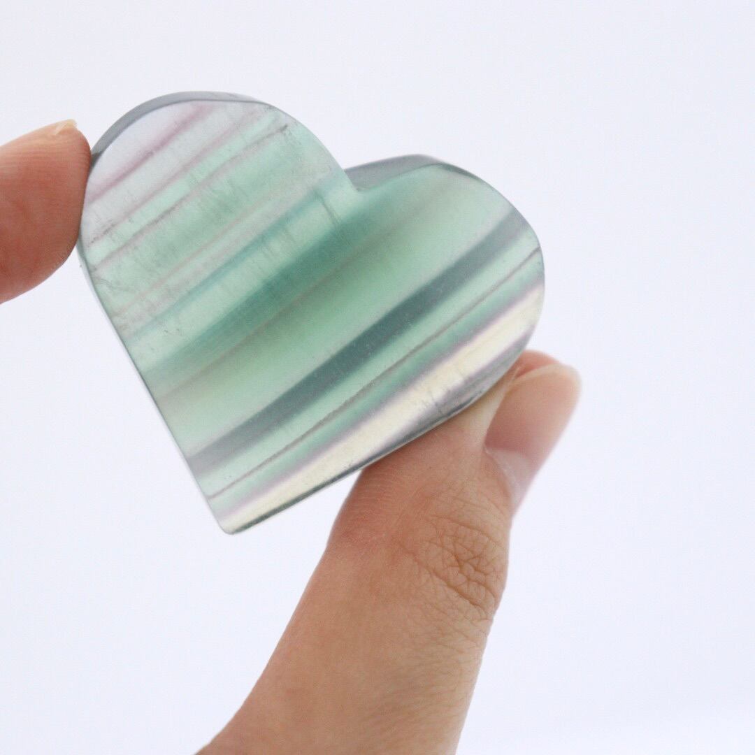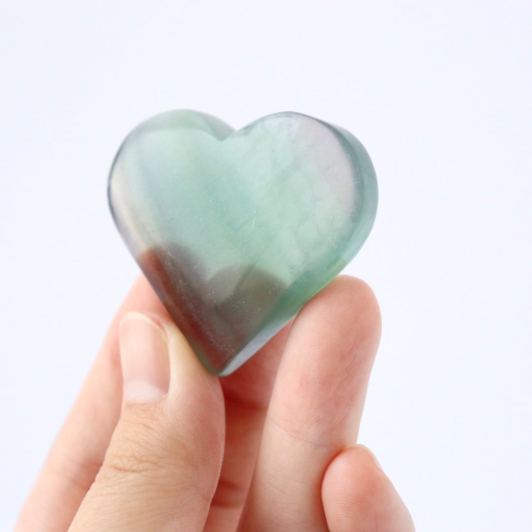 つい触りたくなるような不思議な可愛らしさのグリーンフローライトのハートです。
