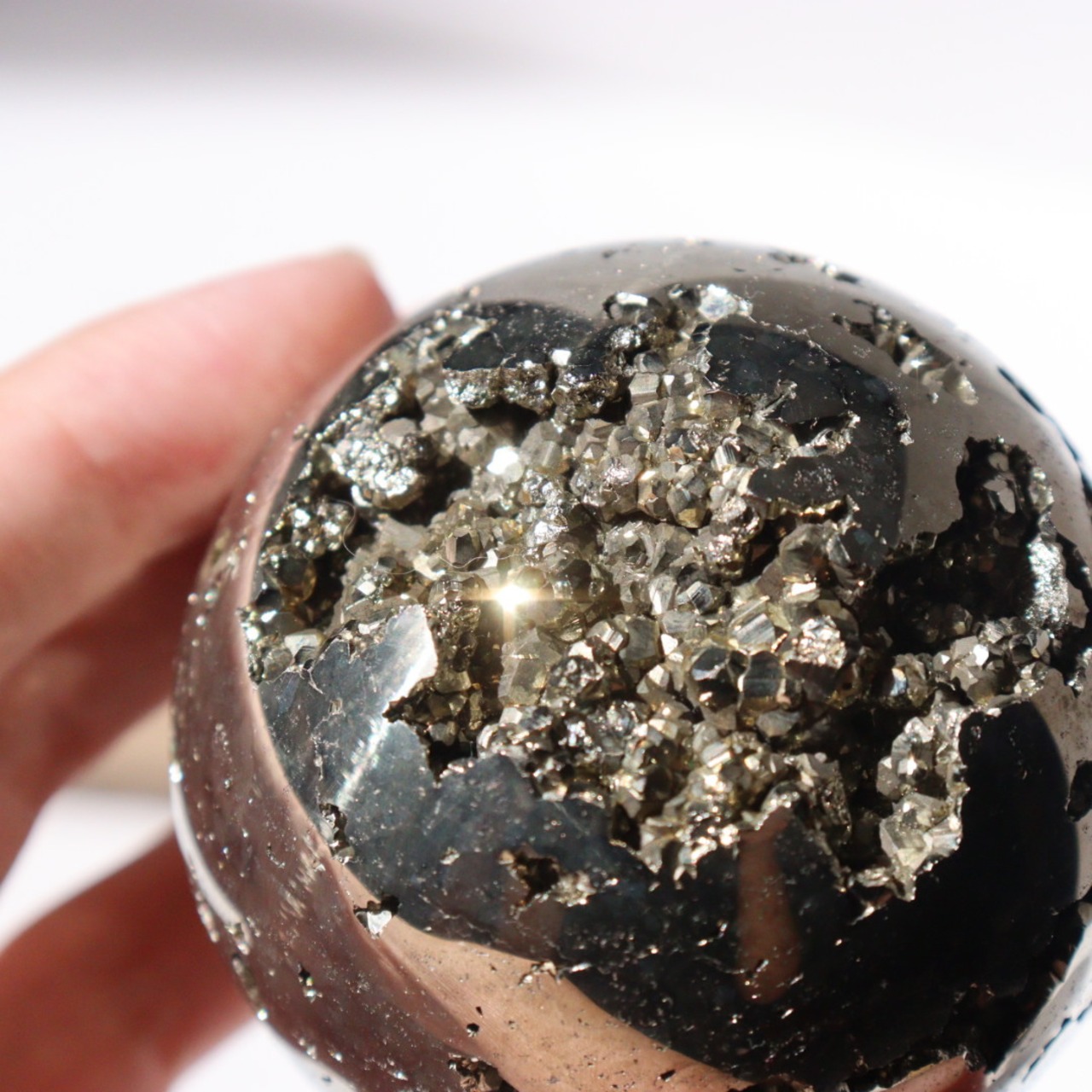 立方体の結晶が神秘的な、ペルー産パイライトのスフィア。