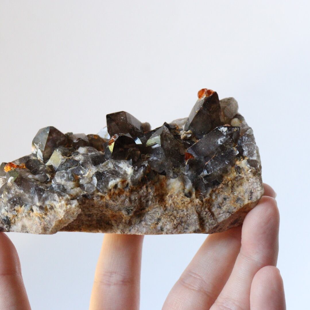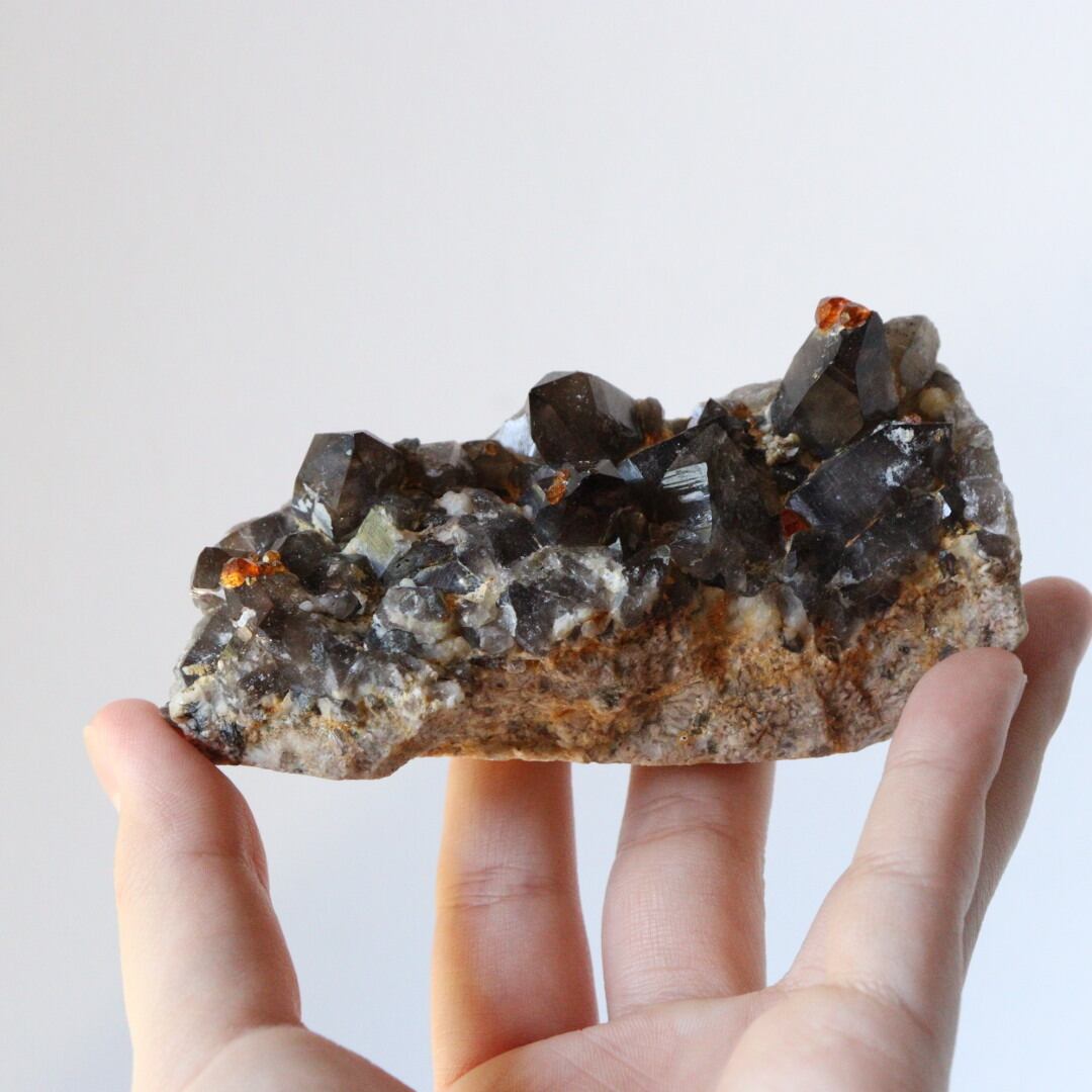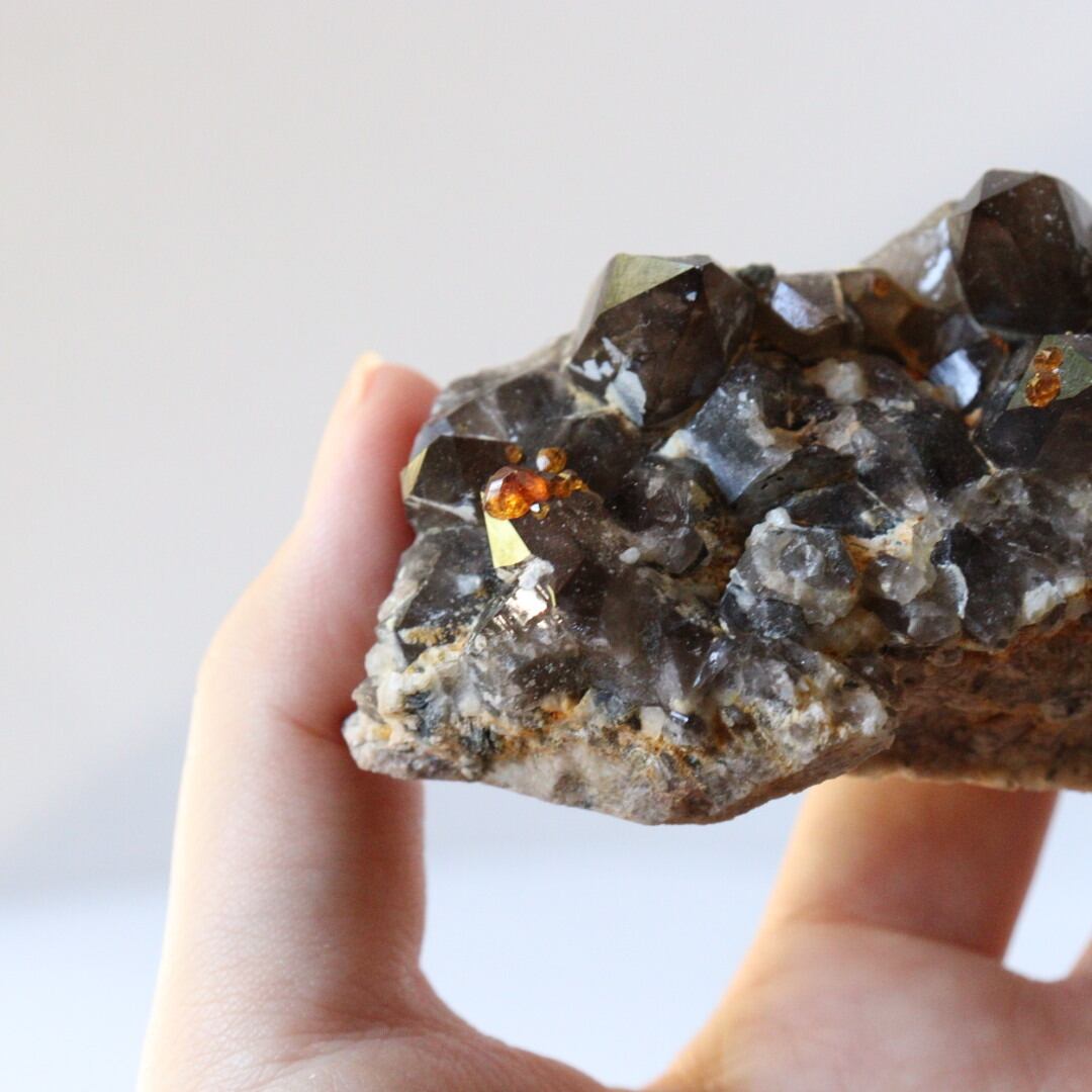 [レア]スモーキークォーツクラスターとスペサルティンガーネットの共生原石