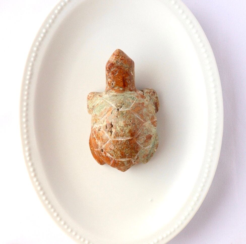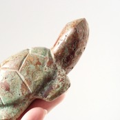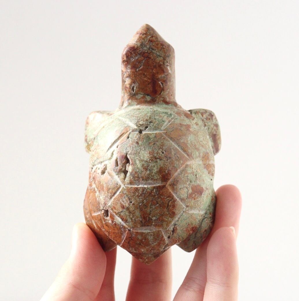 ブラウンの母岩とグリーンのスミソナイトからなり、カメのお腹部分にスミソナイトらしい鮮やかなグリーンが現れています。
