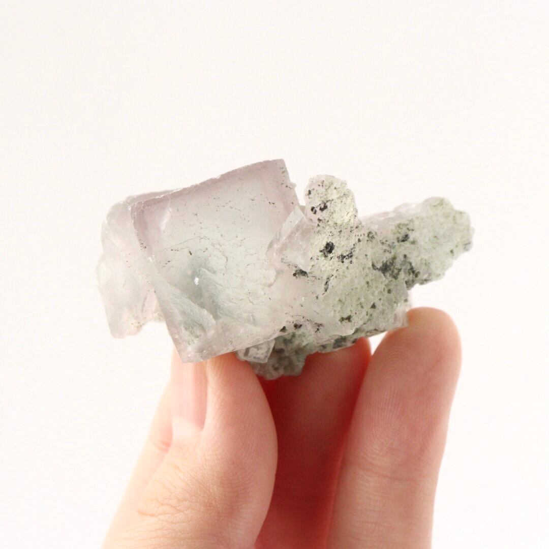 母岩が多く見られる裏側にはフローライトの結晶構造がよくわかる形成途中の結晶も。